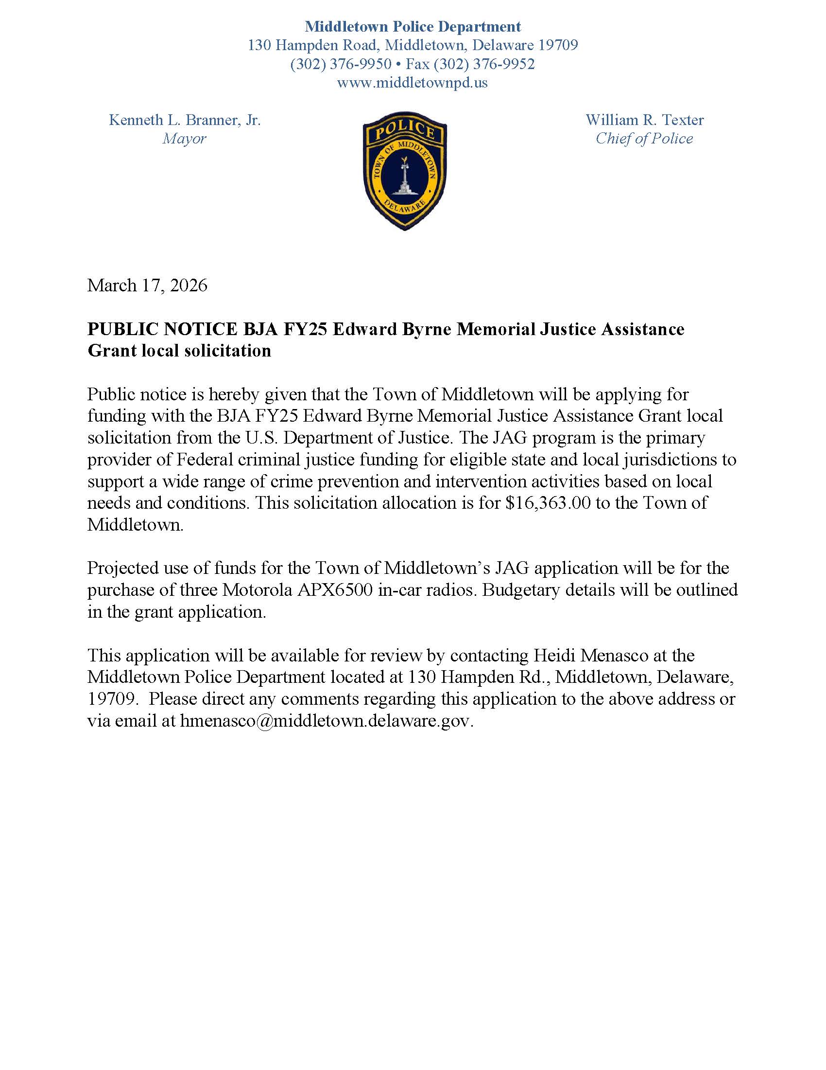 Town of Middletown to apply for funding with the BJA FY25 Edward Byrne Memorial Justice Assistance Grant